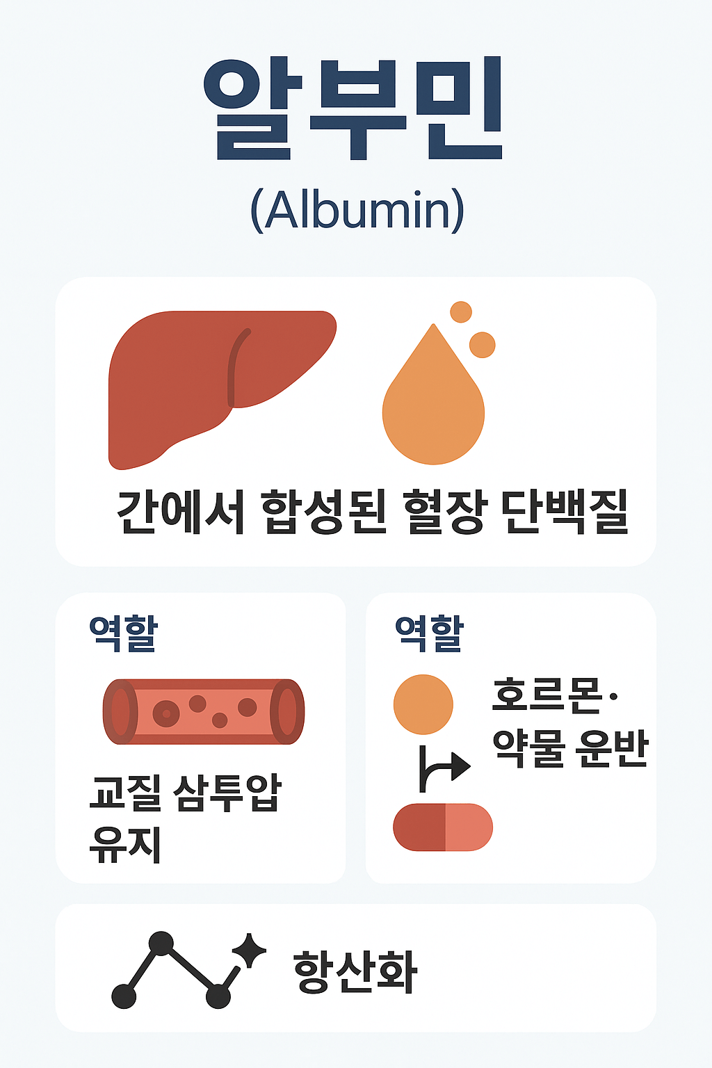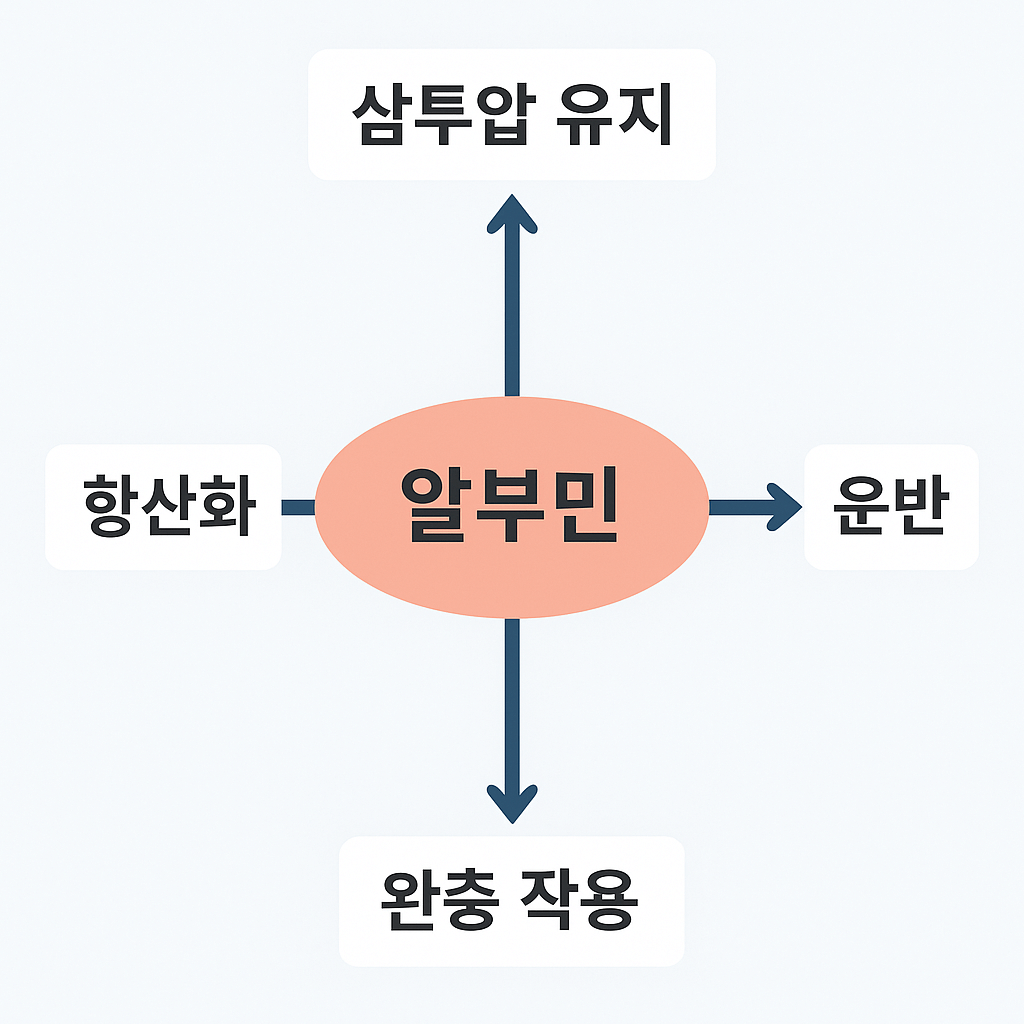 - 알부민은 혈장 단백질 중 비중이 가장 높고 삼투압 유지와 운반, 항산화에 핵심적입니다